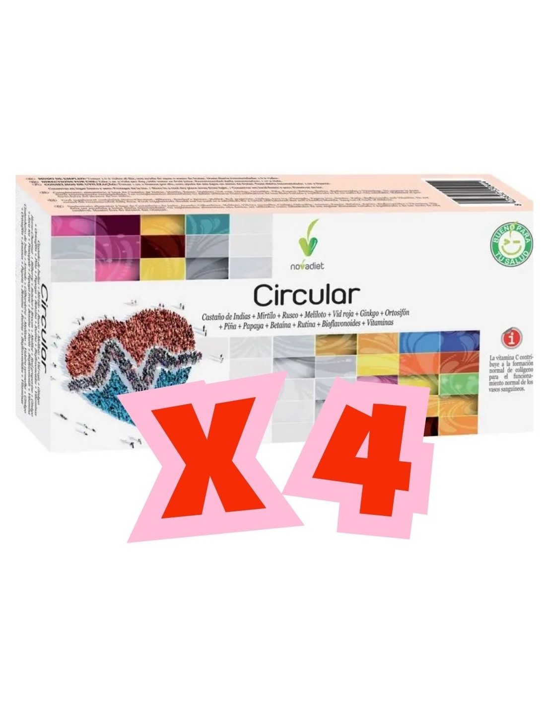 Circular Viales Pack 4 uds de Novadiet es un tratamiento natural intensivo de 80 días de duración, indicado para personas que sufren de pesadez en las piernas, retención de líquidos, varices o mala circulación venosa. Este pack incluye 4 cajas con 20 viales cada una, formulados con extractos vegetales altamente concentrados que favorecen el retorno venoso, el tono capilar y la protección de las paredes vasculares.