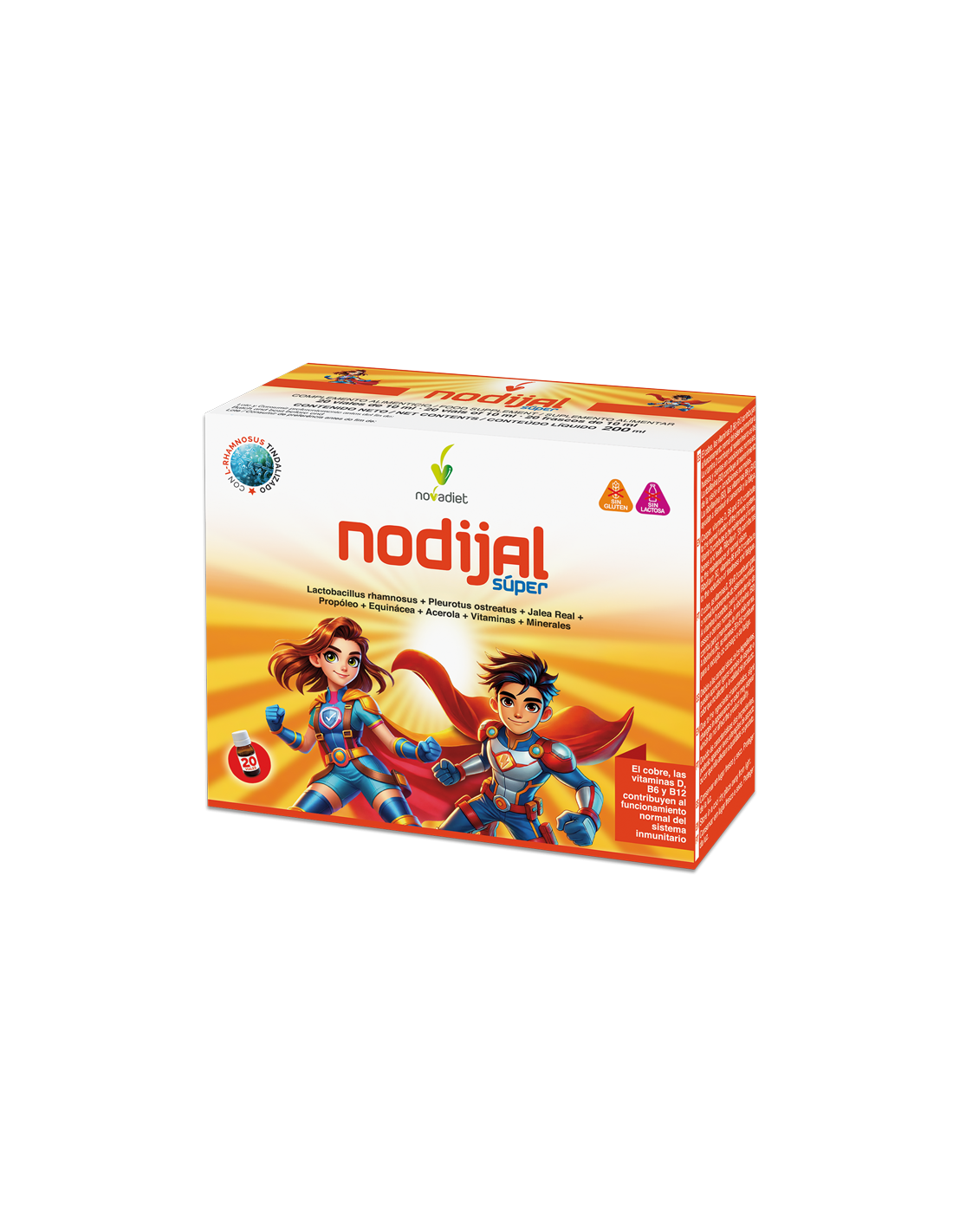 Nodijal Super es un complemento alimenticio infantil de Novadiet, formulado para reforzar el sistema inmunitario de los niños de forma natural y eficaz. Su combinación de jalea real, probióticos (Lactobacillus rhamnosus), beta-glucanos de Pleurotus ostreatus, vitaminas y minerales lo convierten en una ayuda ideal durante épocas de mayor exposición a virus, cambios de estación, guardería o colegio. Se presenta en cómodos viales líquidos, de sabor agradable, que facilitan la toma diaria incluso en los más pequeños.