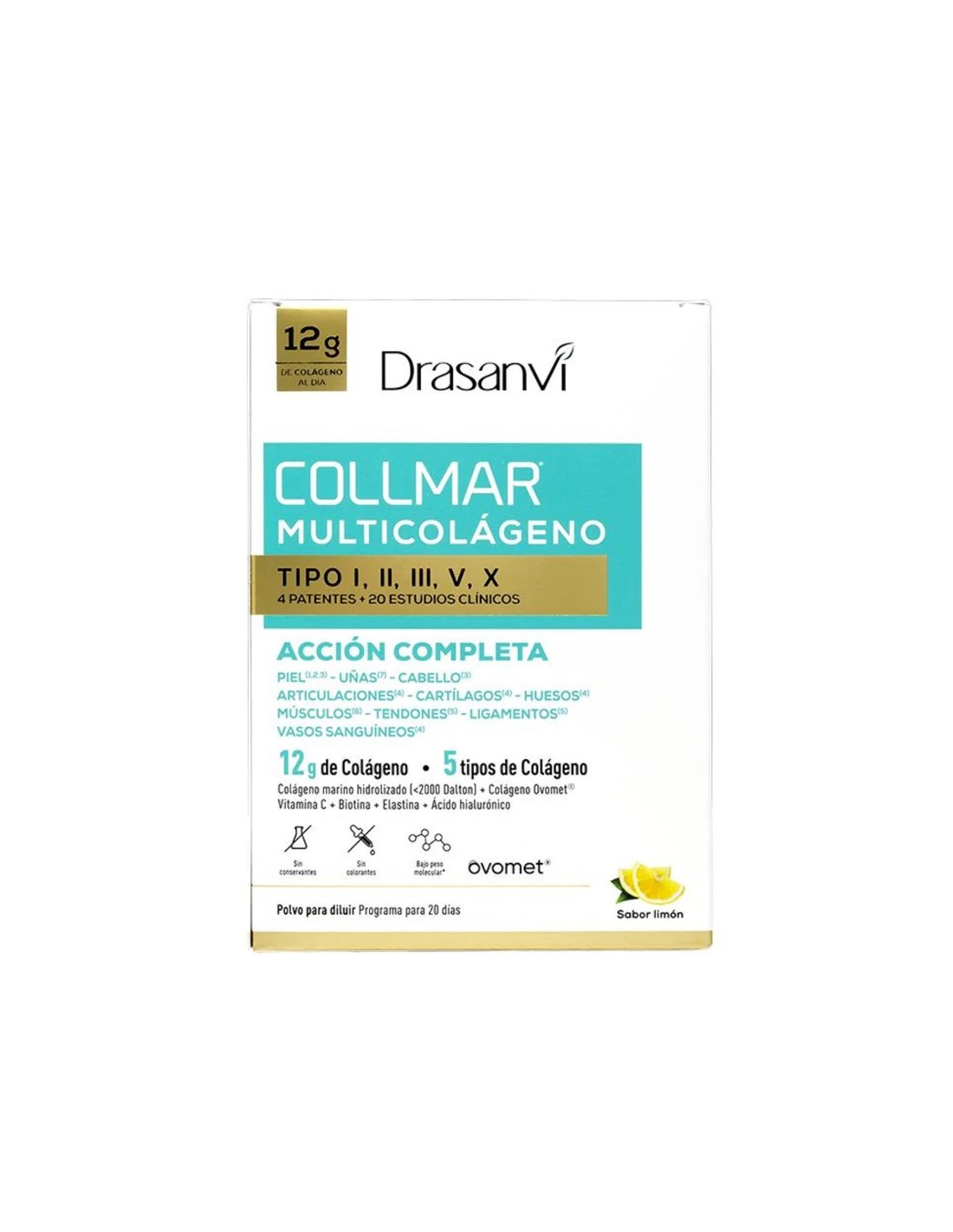 Collmar Multicolágeno Limón de Drasanvi es un suplemento alimenticio en polvo, formulado con 5 tipos diferentes de colágeno marino hidrolizado de bajo peso molecular, combinado con ingredientes clave como ácido hialurónico, elastina, biotina, vitamina C, cobre y extracto de bambú. Una fórmula de última generación que favorece la regeneración de tejidos, la elasticidad de la piel, la fortaleza del cabello y la movilidad articular, todo en un formato fácil de tomar y con sabor agradable a limón.