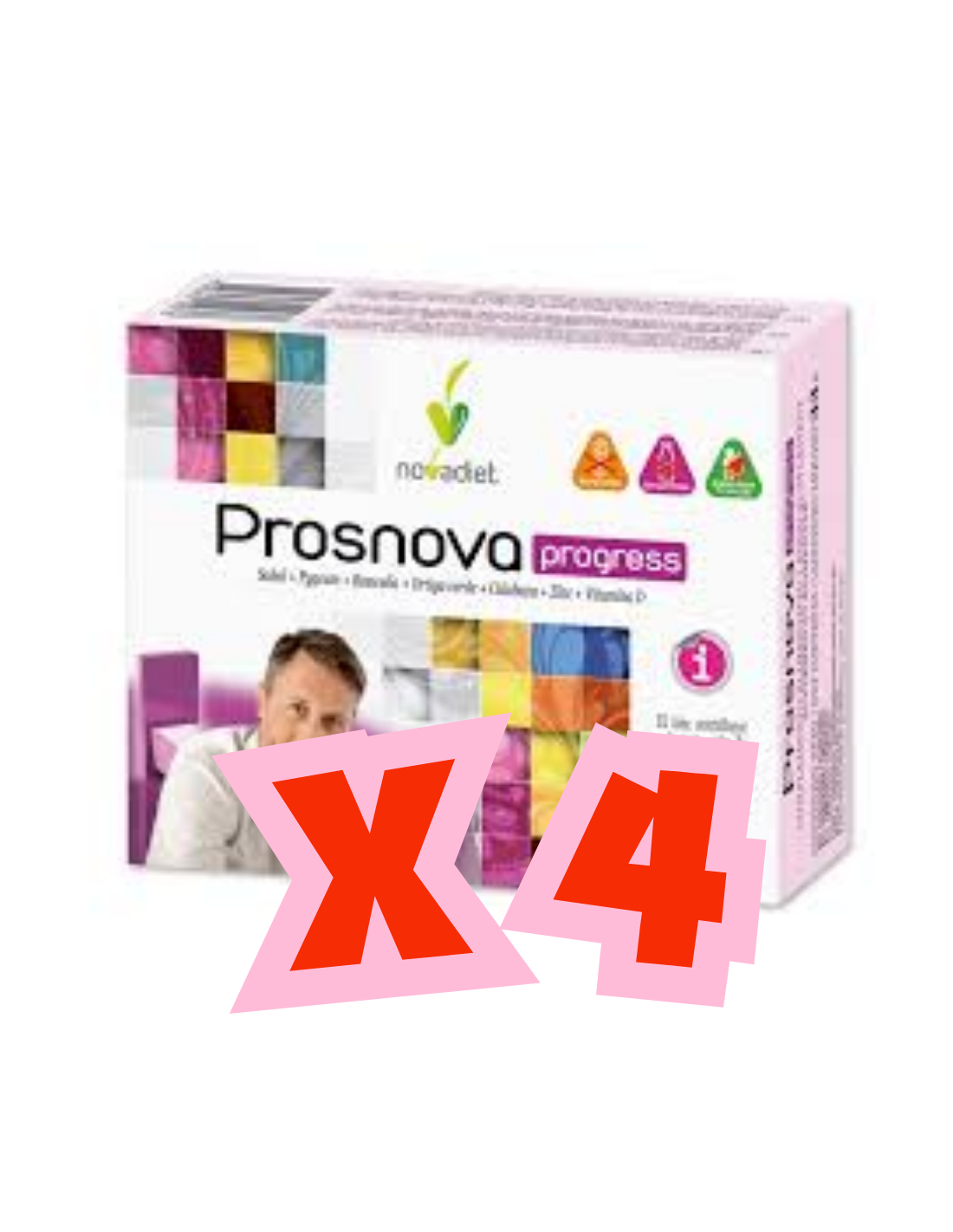 Prosnova Progress es un complemento alimenticio de Novadiet formulado específicamente para proteger la salud prostática, especialmente en hombres a partir de los 45 años que presentan molestias urinarias relacionadas con el aumento de tamaño de la próstata (hiperplasia benigna). Este pack de 4 unidades está pensado como un tratamiento completo de 120 días, que proporciona resultados estables y sostenidos en el tiempo.